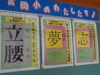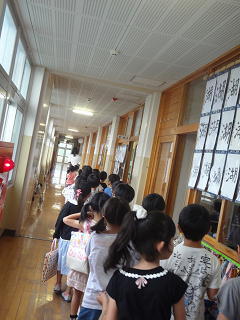 課題は「左右」 4年生の廊下には、懸命に取り組んだ作品が掲げてあります。