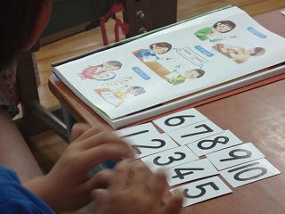 1から10までの数を学びます。リンゴやバナナ等いろいろなものを数えていましたよ。