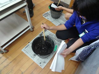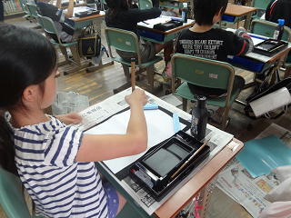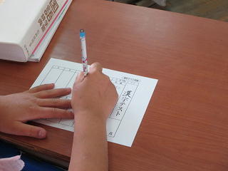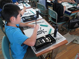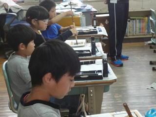初めての習字!まずは道具をそろえて、筆を構える所まで丁寧に学んでいました。ワクワクした表情で取り組んでいましたよ。