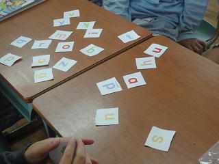 先生の読みあげるアルファベットの文字を誰よりも早く・・・・・取ろうと頑張っていました。