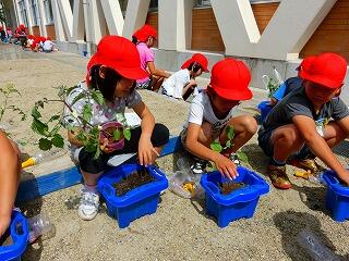 ピーマンやパプリカ、ミニトマトなどの野菜の苗を植えました。