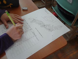 白地図をみて、各都道府県について、5年生で学んだことのふり返りを行っていました。
