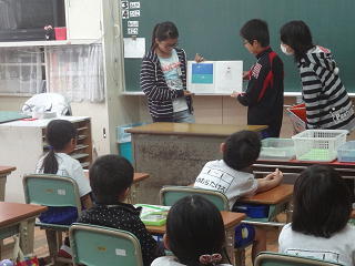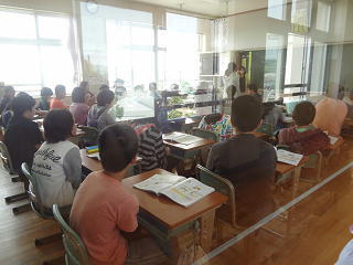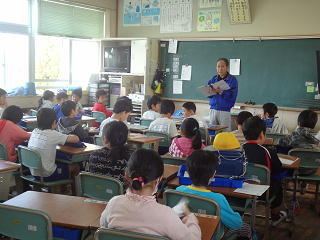 栄養教諭の先生から給食のマナー等について学んでいました。