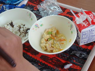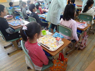6年生のお兄さんやお姉さんが配膳してくれました。みんな静かに待ち、美味しそうにいただいていましたよ。