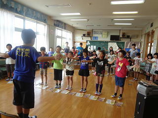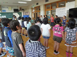 1年生は先生から「まかよし広場」について説明をうけたり、体を動かしたりしていました。