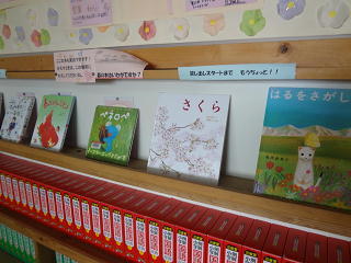 春のお薦めの本が展示してあります。子供たちが興味深く眺めていました。