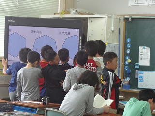 多角形の学習!授業が終了してもみんなで電子黒板の周りでいろいろな考えを出し合っていましたよ。