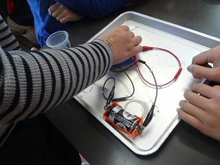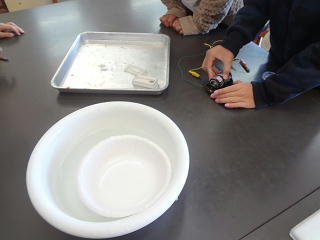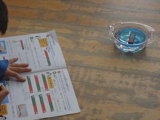 水の中に磁石を入れて・・・実験!興味しんしんの様子でした。