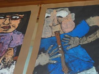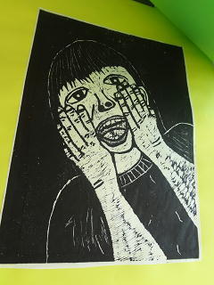4年生の版画の作品が掲げてあります。表情豊かな作品ばかりです。