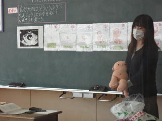 あかちゃんのお人形を手にした先生のお話を真剣にきいていました。