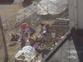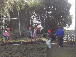 「生き物係」のみなさんを中心に先生といっしょに畑を耕していました。何を育てるのでしょうね?
