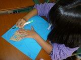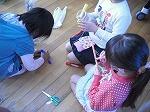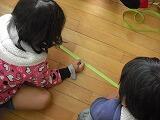 分数の最後の授業で、4分の1、3分の1,7分の1の分数ものさしを紙テープでつくりました。4分の1はすぐできました。3分の1と7分の1は同じ幅の床の板を使ってつくりましたが、すごく難しくて、なかなかぴったしのものさしになりませんでした。でも、あきらめずに頑張ってましたよ。