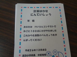 見事100点を取った児童には「計算はかせ にんていしょう」が与えられていますよ。
