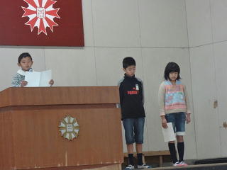 1年生と3年生の代表の児童が2学期をふり返っての作文を発表しました。堂々とした発表にみんなじっと聞き入っていました。