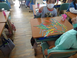1年生は、生活科でまつぼっくりのけん玉とどんぐりごまを作りました。けん玉が「うまく入ると歓声が上がっていました。こまが回るようにつまようじの長さを工夫していました。
