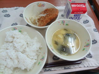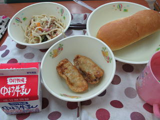 メインはラーメンとぎょうざ・・・。みんなたっぷりの量を美味しく頂きました。6年生はお誕生日のお友達を囲み、牛乳で乾杯してお祝いしていました。