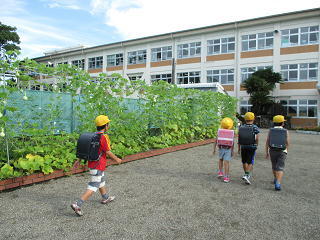 雲がたくさん広がっているものの青空がみえました。緑のカーテンの前を通る子供たち・・・・元気のよいあいさつが交わされていましたよ。