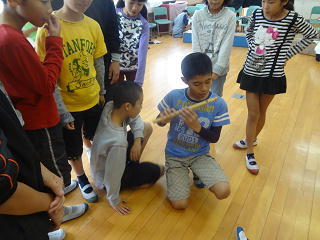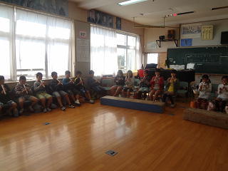 「しの笛」の曲を鑑賞しました。しの笛に挑戦するも、なかなか音がでない・・・。楽器はシンプルだけど奥の深い演奏にみんな興味しんしんの様子でした。