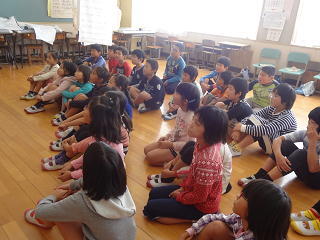 今日のめあてについて意見を交わしていました。「クリーン作戦を成功させよう!」との呼び掛けにみんな頷いていました。子供たちによる朝の会は日々向上しています。