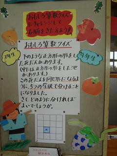 校長室前には難問が掲げられています。「・・・あきらめずに問題を解く・・・」「どんな困難にも毅然として立ち向かってほしい・・・・」そんな思いが込められた掲示です。