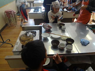 ごはんとみそ汁の実習に大喜びで取り組んでいました。自分たちで作った料理は最高のようでした。