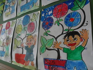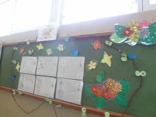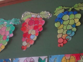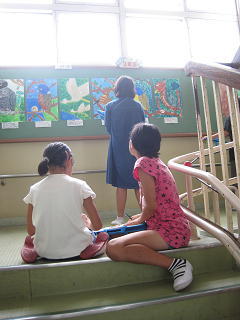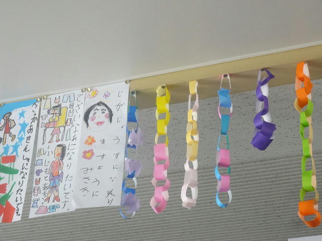 完成した作品が掲げられていました。子供たちは自分やお友達の作品をじっくりみていましたよ。