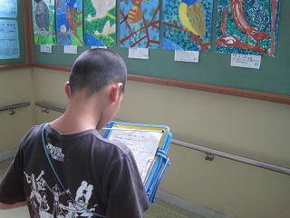 5年生が校内を歩き回り、各学年の図工作品を鑑賞していました。