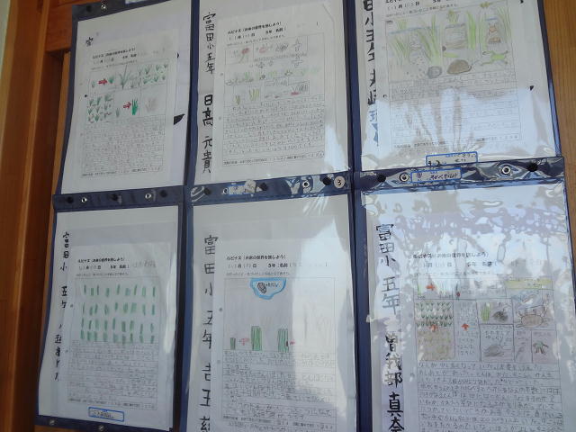 自分たちが育てている稲の観察記録が掲げられています。子供たちは細かく観察しているようです。