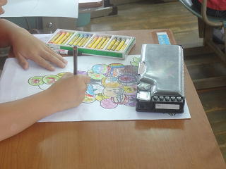 クレヨンのいろいろな色を使って作品を作っています。楽しい作品が出来そうです。