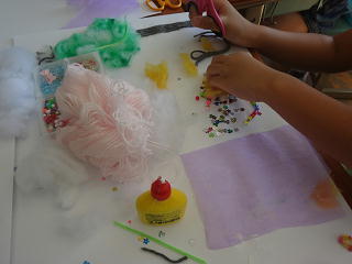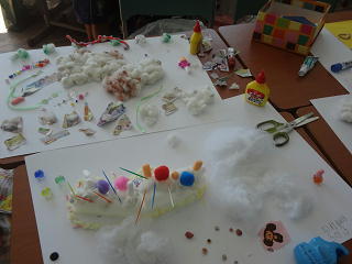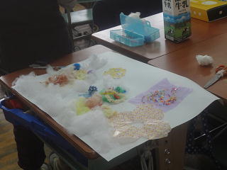 キラキラのビーズやふわふわの毛糸・・・。自分のお家にあるお気に入りの材料で、夢の世界を作っていました。楽しさ溢れる活動でした。