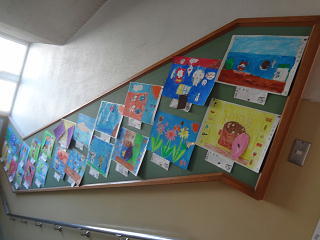 東児湯地区の各学校を代表する素晴らしい作品が校長室前に掲げられています。子供たちは立ち止ってじっくり鑑賞していました。