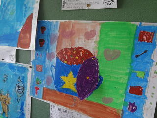 5年生の掲示板には、5年生が創造した銀河鉄道の絵が掲げられていますよ。夜空を見上げると・・・・、こんな列車が走っているのでしょうね。