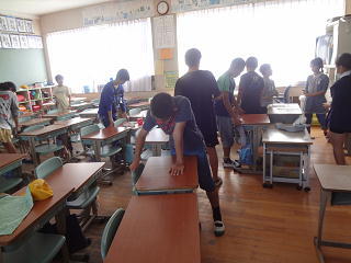 クラスメイトで力を合わせて・・・。机並べ・・廊下拭き・・、特別教室等・・・。懸命な清掃活動が行われています。