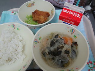 お昼は学級委員長さんと副委員長さん手作りのそうめん汁です。ちりめんのダシのよく出た温かい汁、トッピングは卵・貝割れ・かまぼこです。お代わり続出でした。
