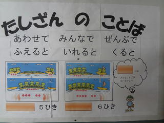 最後はお菓子のくじ引きです。クラスの女の子のアイディアで繰り上がりのたしざんの答えがお菓子のナンバーでした。やる気満々、計算も冴えていました。