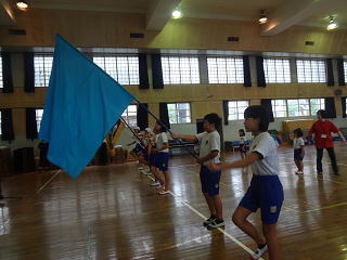 運動会の全体練習は雨のため中止になりました。代表の児童が講堂に集まり、開会式・閉会式の流れにそった練習を行いました。