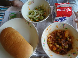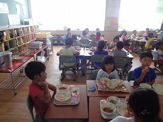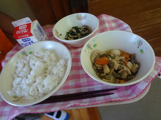 今日から1年生は自分たちで給食の準備をします。自分たちで準備した給食は、いつもより、より楽しい時間になったようです。
