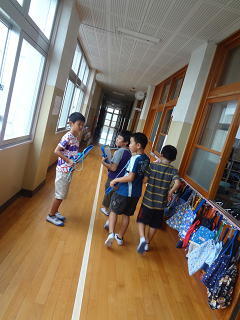 ナップサックが出来上がりました。中央階段に、それぞれの児童の写真がコメントと共に掲げてあります。地域の皆様方ご協力ありがとうございました。