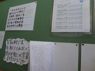 自分で学んだ軌跡が記されたノート・・・。素晴らしいノートの例が掲げてあります。「このようなノートを参考にして学びが身に付く学習を習得してほしい・・・」との願いが込められていますよ。