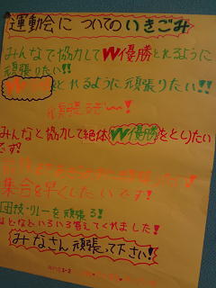 運動会への意気込みを中央階段に記しました。一つの目標にむかって学校が動き出していますね。