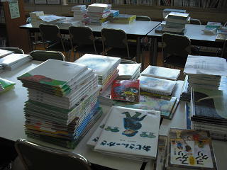 新しく届いた本の登録が終わり、学級ごとに分けられました。教科書で紹介されている本もたくさん届きました。