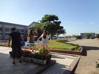 水やりを行っている先生方と元気にあいさつを交わしていました。