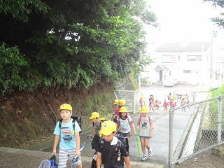 台風接近!地区別に集まり、担当の先生のお話を聞いた後、集団下校を行いました。先生方も担当地区について行かれ、下校指導を行いました。