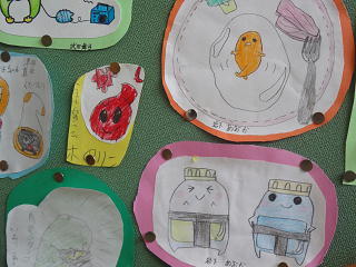 「宇宙船を作って宇宙に行ってみたいな・・・」それぞれの思いが絵になって表現されています。中央階段に掲げられていますよ。