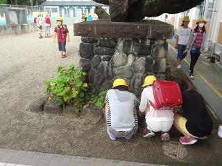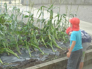 学年園・・・台風で倒れてしまった作物を大事そうに起こしてあげていました。