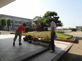 いつもは、6年生が朝のボランティア活動や栽培委員会の活動で行っている水やり・・・。夏休み期間中は職員がバトンをうけついで行います。