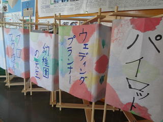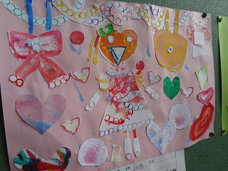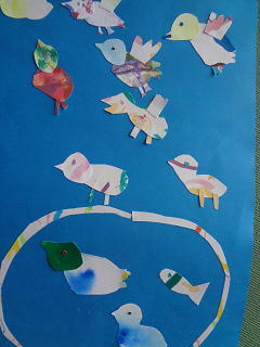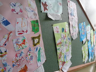 「ハートちゃんのお家」「小鳥さんの散歩・・・」マーブル技法を使った夢のあふれる作品が西階段に掲示してありますよ。