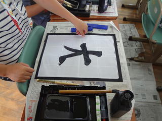 学校支援ボランティアの方々の支援を受けて、「麦」の文字に挑戦!