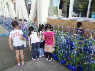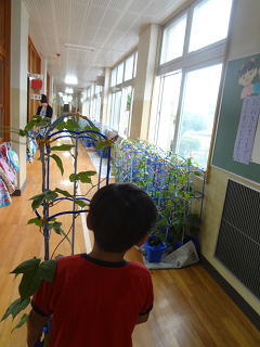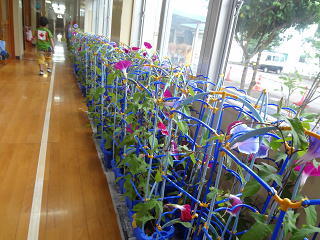 一人一人が自分の育てているアサガオにお水をあげていましたよ。たくさんの色とりどりのアサガオが花を咲かせてきています。子供たちは嬉しそうにお世話を続けていますよ。