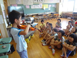 バイオリンにふれてみて・・・、みんな興味しんしん!